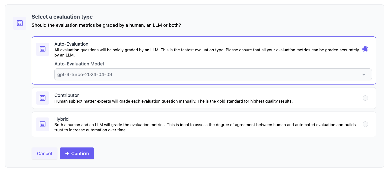 For generation datasets, you will be able to select auto-evaluation when configuring the evaluation run. When configuring the evaluation run on the variant, you can either select Auto-Evaluation or Hybrid to enable an auto evaluation on the run (hybrid evaluations will run both an auto-evaluation and enable humans to annotate).