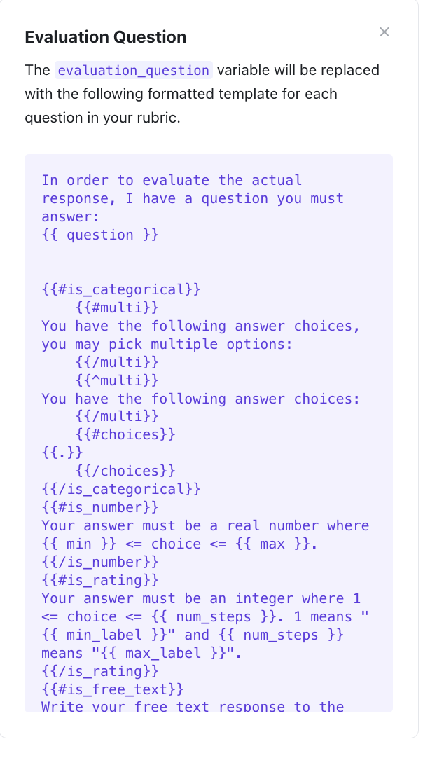 Evaluation Question - This is a prompt that tells the LLM to answer the evaluation question from the rubric. Currently, it is non configurable, and the prompt for this template depends on the type of question that is configured in the rubric. For example, it’ll prompt the LLM differently on how to ansewr the question based on if it’s a multiple choice or free text question. Including this variable is required in the overall prompt, and the contents of this prompt will be injected into the overall prompt at the location of the variable.