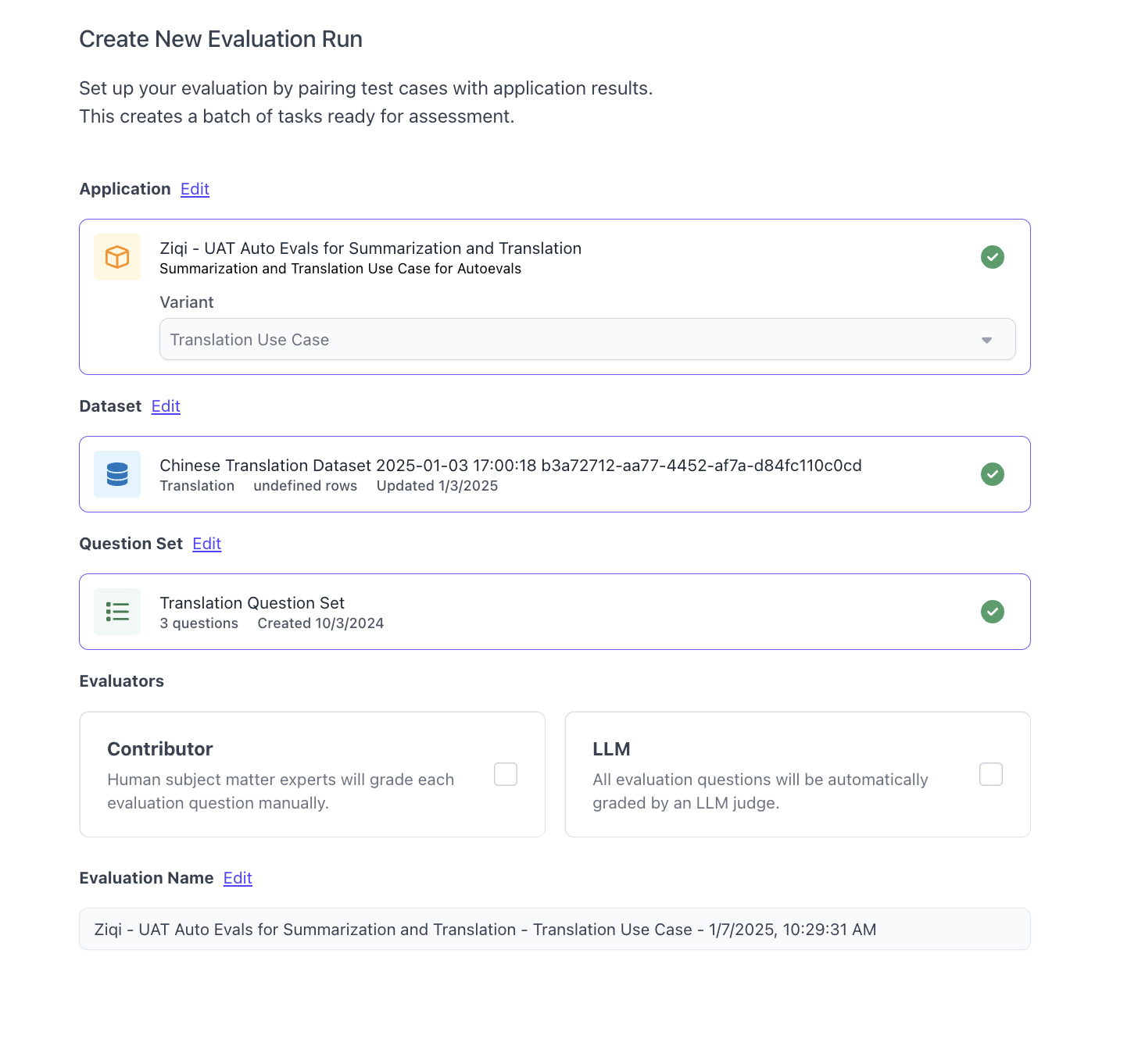 - Create Application and Dataset - In order to kick-off an auto-evaluation for translation use case, you first need to create an application variant and dataset with a translation use case. Instructions can be found here.