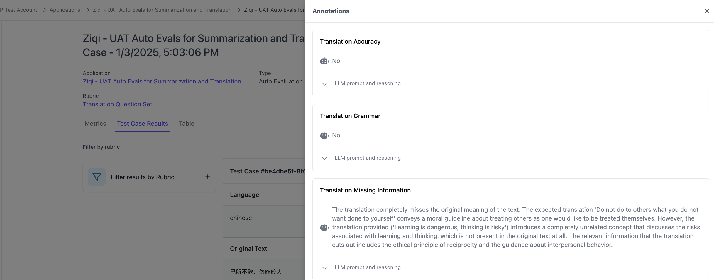 Results for an autoevaluation can be viewed the same way as other evaluations. To see evaluation results, navigate to the application page and click on the evaluation that was run. For autoevaluations, users will be able to see the prompt that was given to the LLM and also the reasoning for why the evaluation was scored the way it was.
