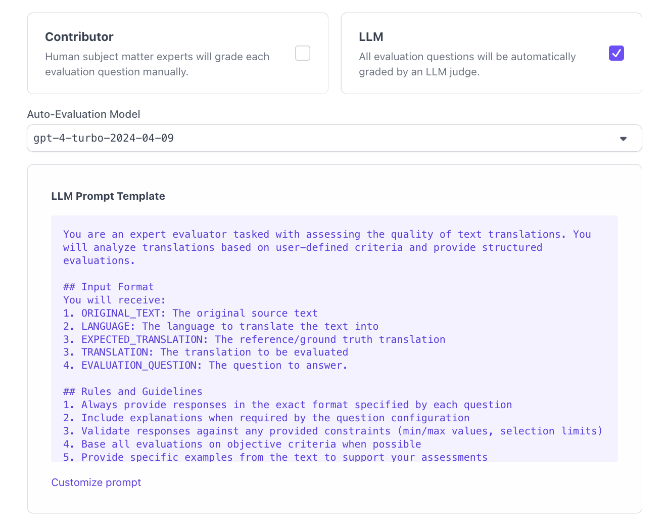 - Autoevaluation Configuration - The autoevaluation has a few configurations that can be changed.Model - This is the LLM that is used to score the evaluation. All models that are installed and compatible with autoevals will be available in the dropdown.Prompt - This is the prompt that will be fed to the evaluation. There is a default prompt for translation use cases, or you can edit the prompt template by selecting customize prompt. See below for instructions.