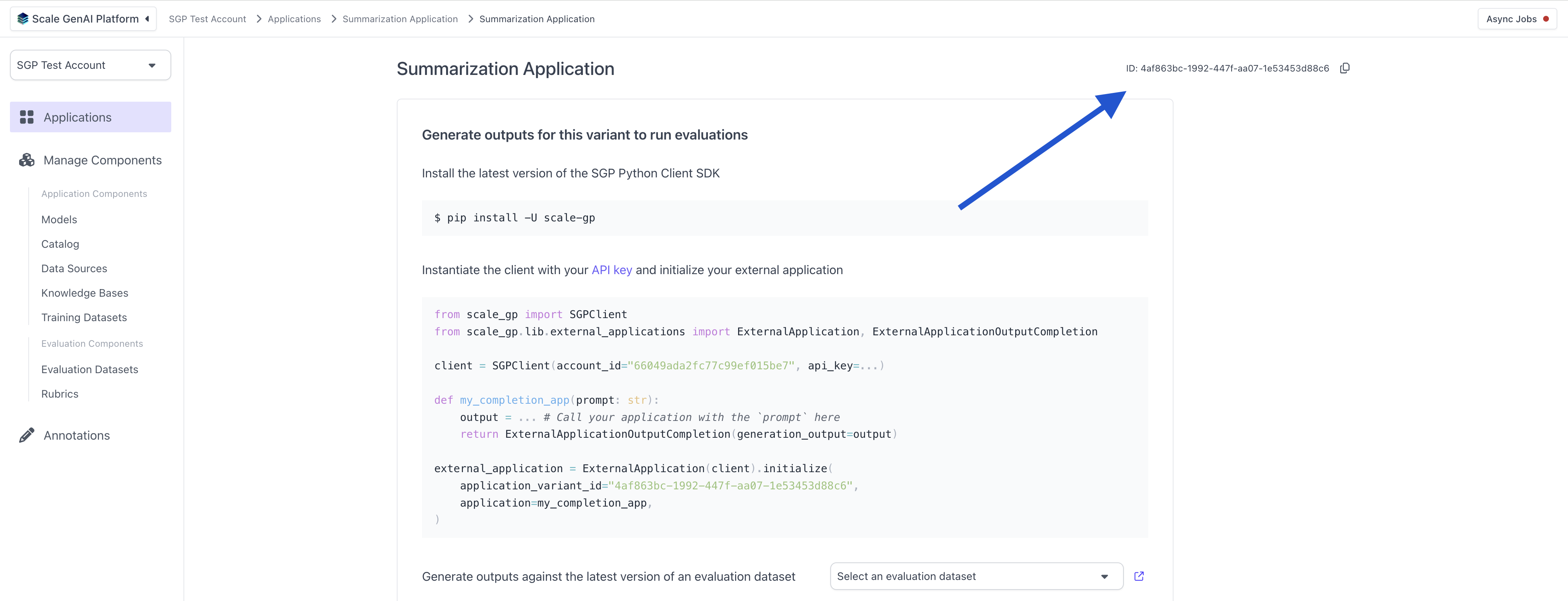 Next, we create the actual evaluation dataset and upload it to the relevant account in SGP. After running this, you’ll be able to see the evaluation dataset in the UI when navigating to the “Evaluation Datasets” section in the left hand side bar.